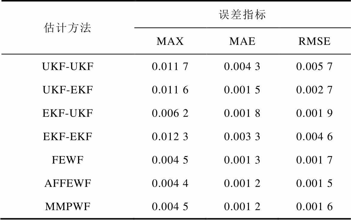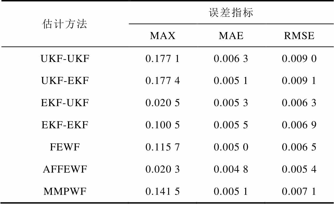 估计方法误差指标 MAXMAERMSE UKF-UKF0.177 10.006 30.009 0 UKF-EKF0.177 40.005 10.009 1 EKF-UKF0.020 50.005 30.006 3 EKF-EKF0.100 50.005 50.006 9 FEWF0.115 70.005 00.006 5 AFFEWF0.020 30.004 80.005 4 MMPWF0.141 50.005 10.007 1