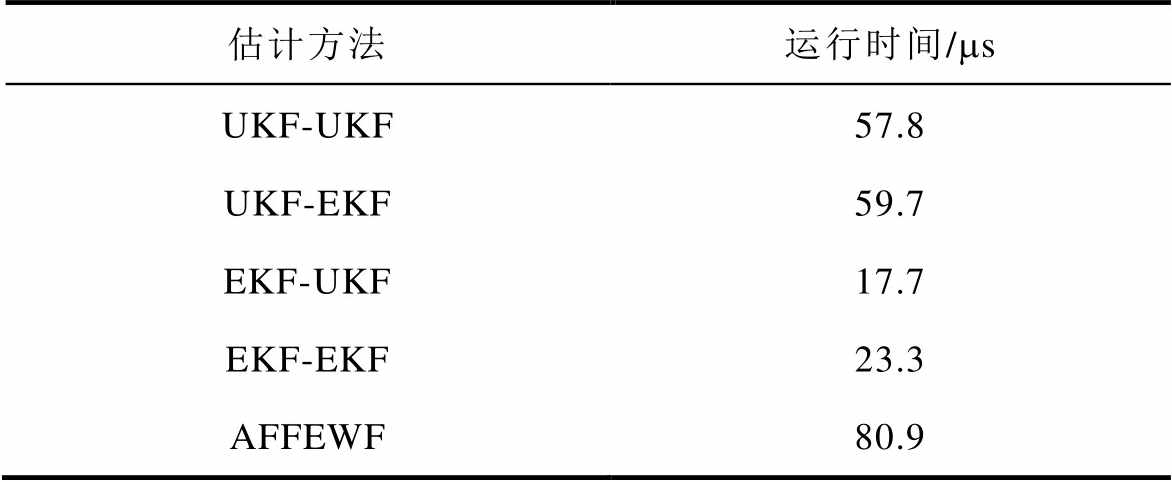 估计方法运行时间/ms UKF-UKF57.8 UKF-EKF59.7 EKF-UKF17.7 EKF-EKF23.3 AFFEWF80.9