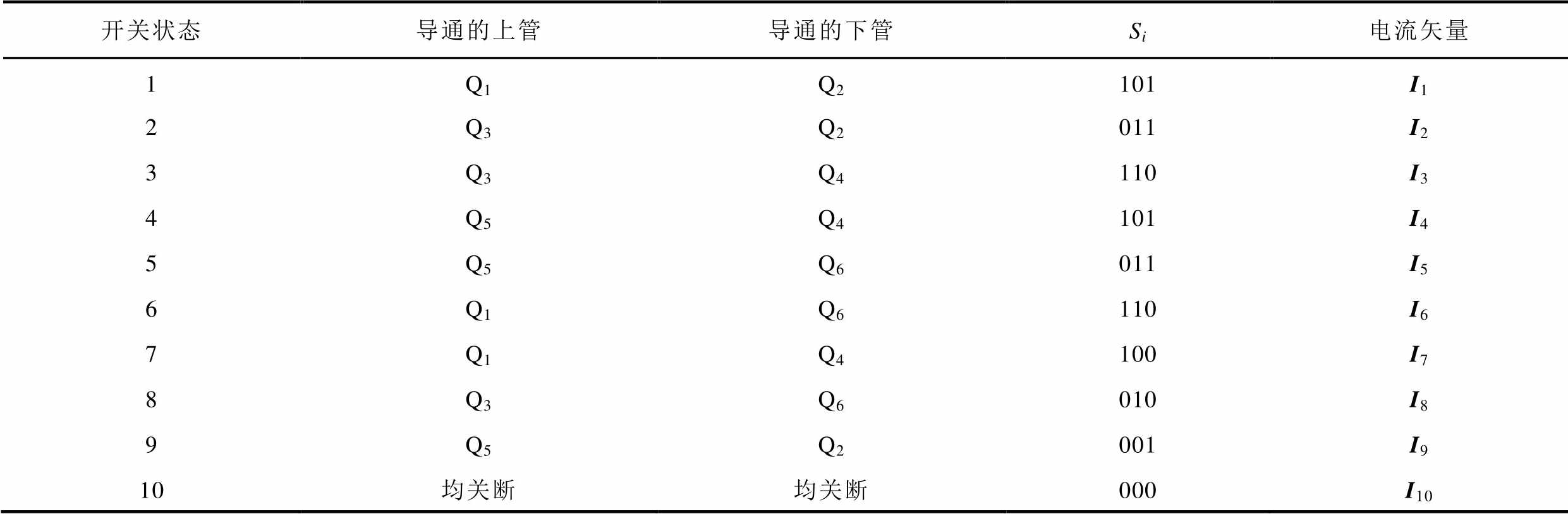 开关状态导通的上管导通的下管Si电流矢量 1Q1Q2101I1 2Q3Q2011I2 3Q3Q4110I3 4Q5Q4101I4 5Q5Q6011I5 6Q1Q6110I6 7Q1Q4100I7 8Q3Q6010I8 9Q5Q2001I9 10均关断均关断000I10