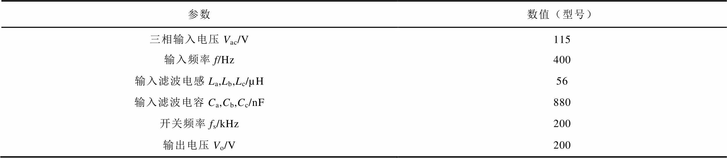 参数数值(型号) 三相输入电压Vac/V115 输入频率f/Hz400 输入滤波电感La,Lb,Lc/µH56 输入滤波电容Ca,Cb,Cc/nF880 开关频率fs/kHz200 输出电压Vo/V200