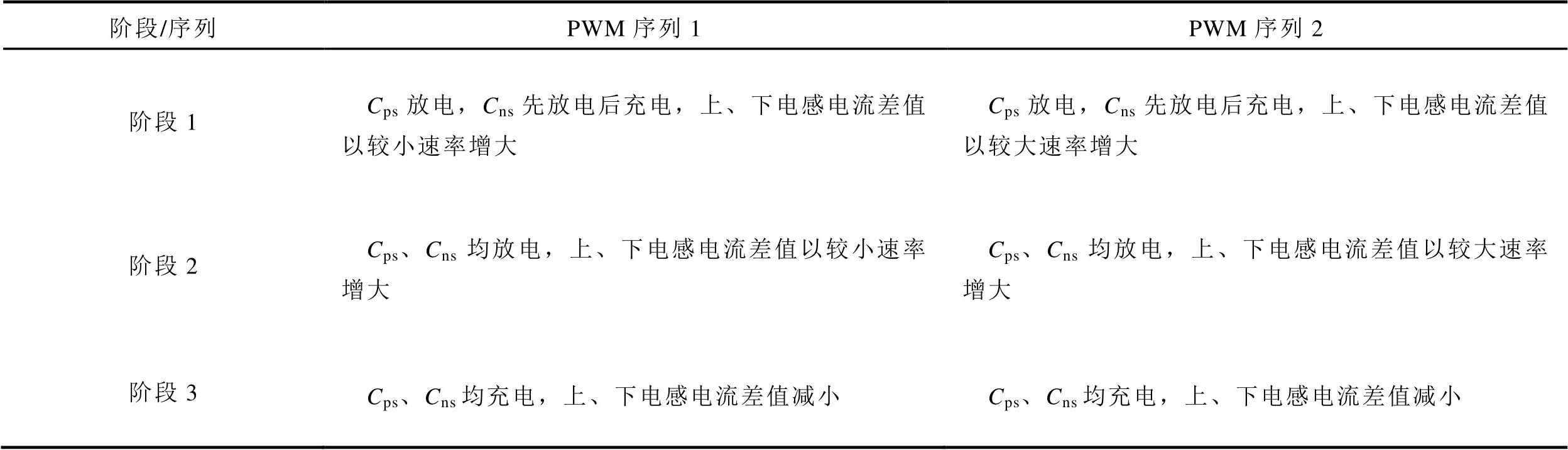 阶段/序列PWM序列1PWM序列2 阶段1Cps放电,Cns先放电后充电,上、下电感电流差值以较小速率增大Cps放电,Cns先放电后充电,上、下电感电流差值以较大速率增大 阶段2Cps、Cns均放电,上、下电感电流差值以较小速率增大Cps、Cns均放电,上、下电感电流差值以较大速率增大 阶段3Cps、Cns均充电,上、下电感电流差值减小Cps、Cns均充电,上、下电感电流差值减小