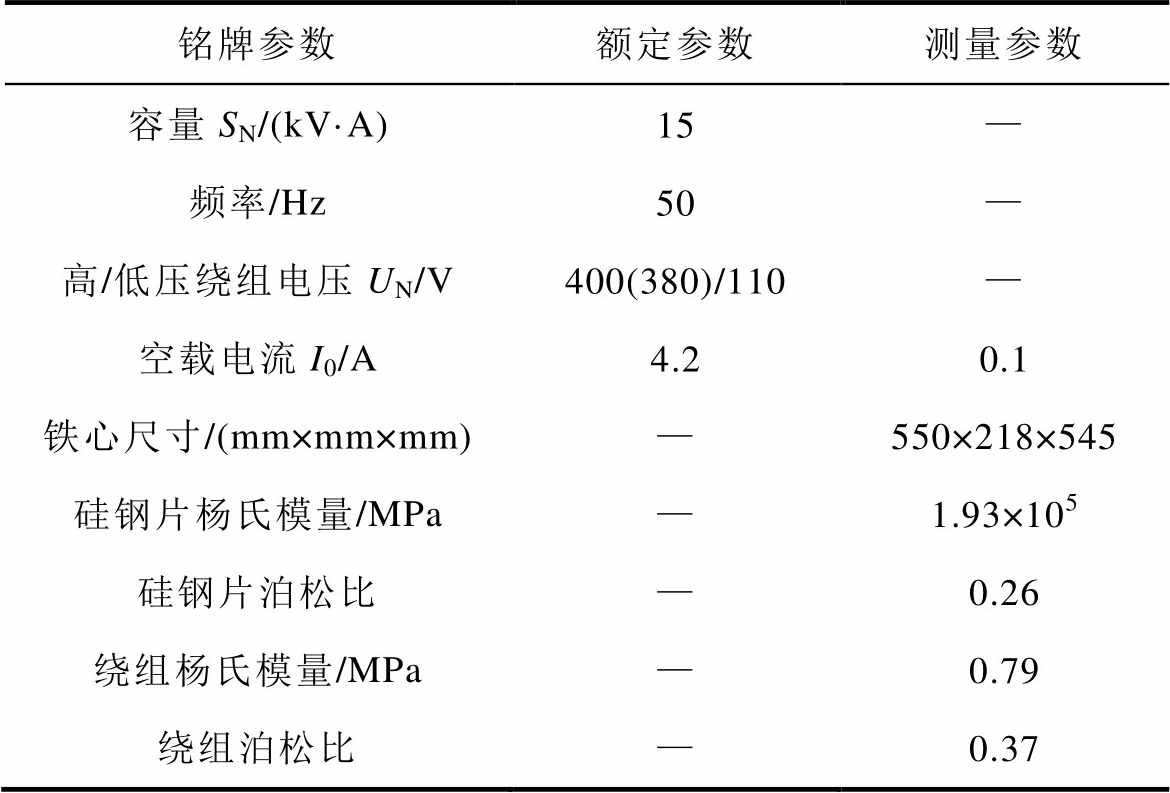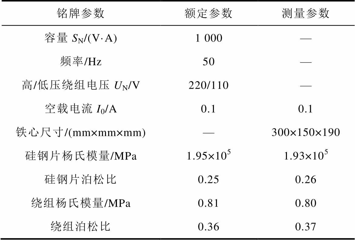 铭牌参数额定参数测量参数 容量SN/(V·A)1 000— 频率/Hz50— 高/低压绕组电压UN/V220/110— 空载电流I0/A0.10.1 铁心尺寸/(mm×mm×mm)—300×150×190 硅钢片杨氏模量/MPa1.95×1051.93×105 硅钢片泊松比0.250.26 绕组杨氏模量/MPa0.810.80 绕组泊松比0.360.37