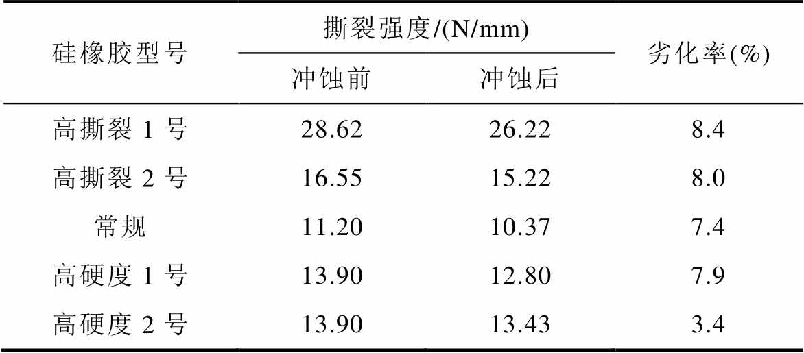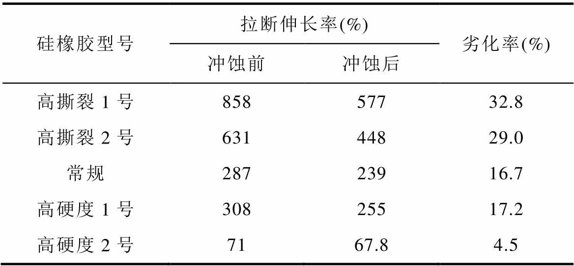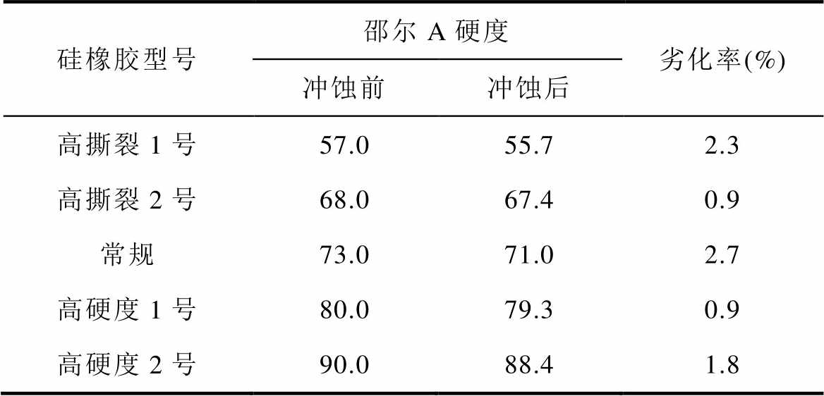 硅橡胶型号邵尔A硬度劣化率(%) 冲蚀前冲蚀后 高撕裂1号57.055.72.3 高撕裂2号68.067.40.9 常规73.071.02.7 高硬度1号80.079.30.9 高硬度2号90.088.41.8