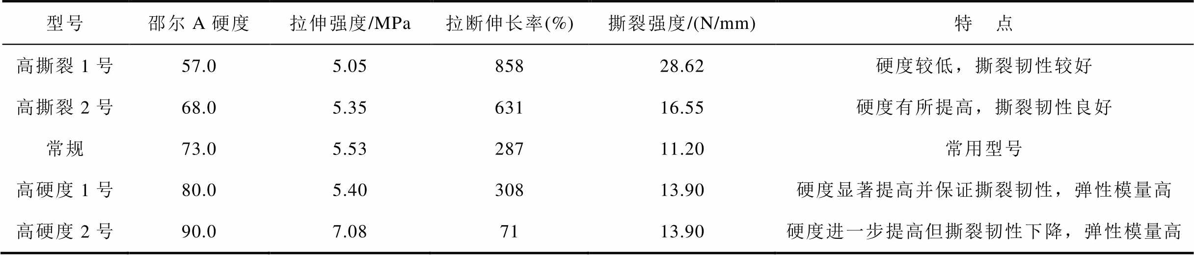 型号邵尔A硬度拉伸强度/MPa拉断伸长率(%)撕裂强度/(N/mm)特 点 高撕裂1号57.05.0585828.62硬度较低,撕裂韧性较好 高撕裂2号68.05.3563116.55硬度有所提高,撕裂韧性良好 常规73.05.5328711.20常用型号 高硬度1号80.05.4030813.90硬度显著提高并保证撕裂韧性,弹性模量高 高硬度2号90.07.087113.90硬度进一步提高但撕裂韧性下降,弹性模量高