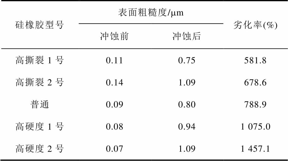 硅橡胶型号表面粗糙度/mm劣化率(%) 冲蚀前冲蚀后 高撕裂1号0.110.75581.8 高撕裂2号0.141.09678.6 普通0.090.80788.9 高硬度1号0.080.941 075.0 高硬度2号0.071.091 457.1