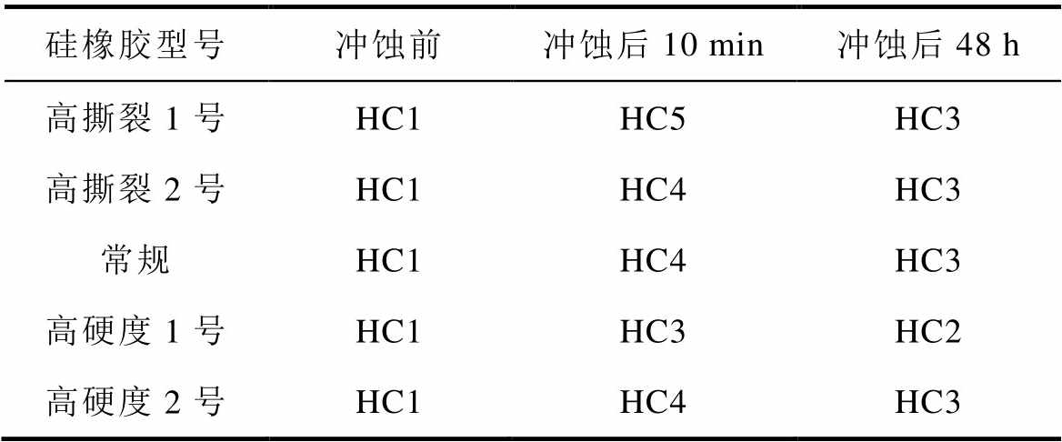 硅橡胶型号冲蚀前冲蚀后10 min冲蚀后48 h 高撕裂1号HC1HC5HC3 高撕裂2号HC1HC4HC3 常规HC1HC4HC3 高硬度1号HC1HC3HC2 高硬度2号HC1HC4HC3
