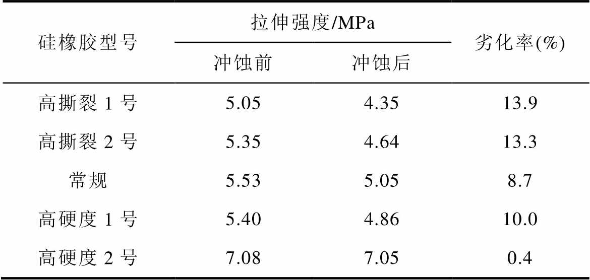 硅橡胶型号拉伸强度/MPa劣化率(%) 冲蚀前冲蚀后 高撕裂1号5.054.3513.9 高撕裂2号5.354.6413.3 常规5.535.058.7 高硬度1号5.404.8610.0 高硬度2号7.087.050.4