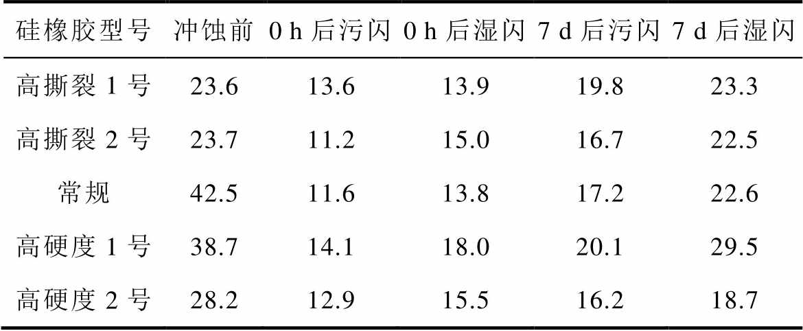 硅橡胶型号冲蚀前0 h后污闪0 h后湿闪7 d后污闪7 d后湿闪 高撕裂1号23.613.613.919.823.3 高撕裂2号23.711.215.016.722.5 常规42.511.613.817.222.6 高硬度1号38.714.118.020.129.5 高硬度2号28.212.915.516.218.7