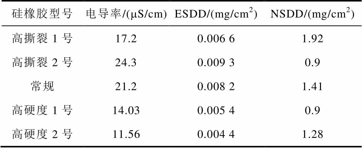 硅橡胶型号电导率/(mS/cm)ESDD/(mg/cm2)NSDD/(mg/cm2) 高撕裂1号17.20.006 61.92 高撕裂2号24.30.009 30.9 常规21.20.008 21.41 高硬度1号14.030.005 40.9 高硬度2号11.560.004 41.28