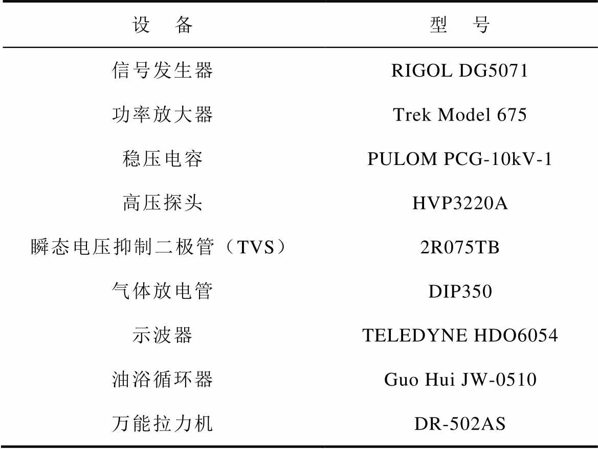 设 备型 号 信号发生器RIGOL DG5071 功率放大器Trek Model 675 稳压电容PULOM PCG-10kV-1 高压探头HVP3220A 瞬态电压抑制二极管(TVS)2R075TB 气体放电管DIP350 示波器TELEDYNE HDO6054 油浴循环器Guo Hui JW-0510 万能拉力机DR-502AS