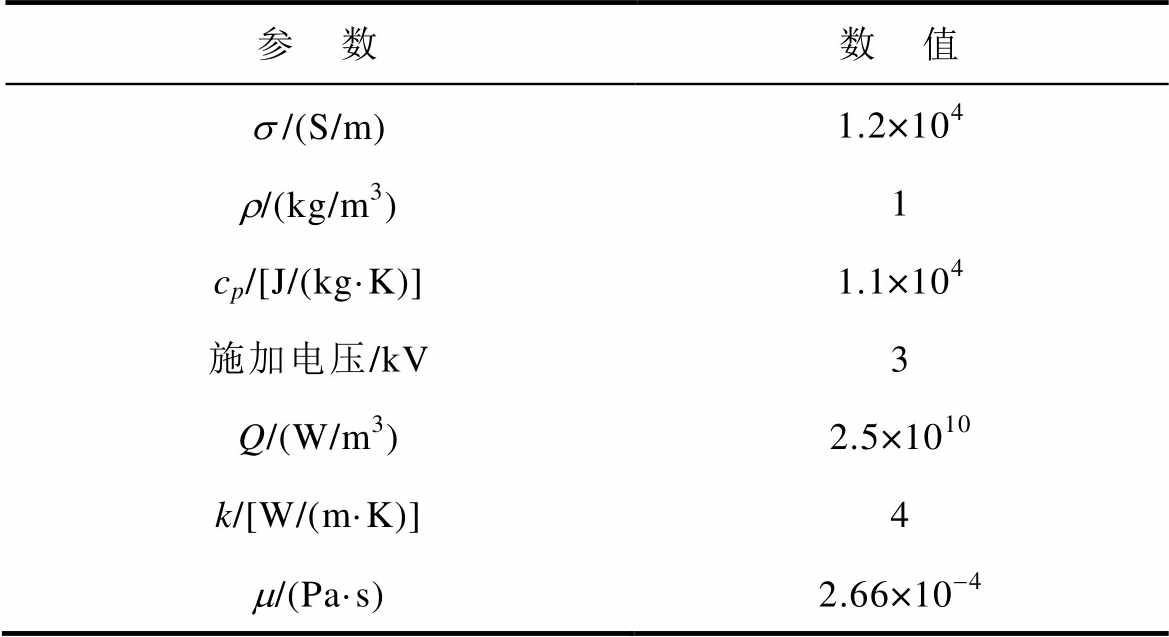 参 数数 值 s/(S/m)1.2×104 r/(kg/m3)1 cp/[J/(kg·K)]1.1×104 施加电压/kV3 Q/(W/m3)2.5×1010 k/[W/(m·K)]4 m/(Pa·s)2.66×10-4