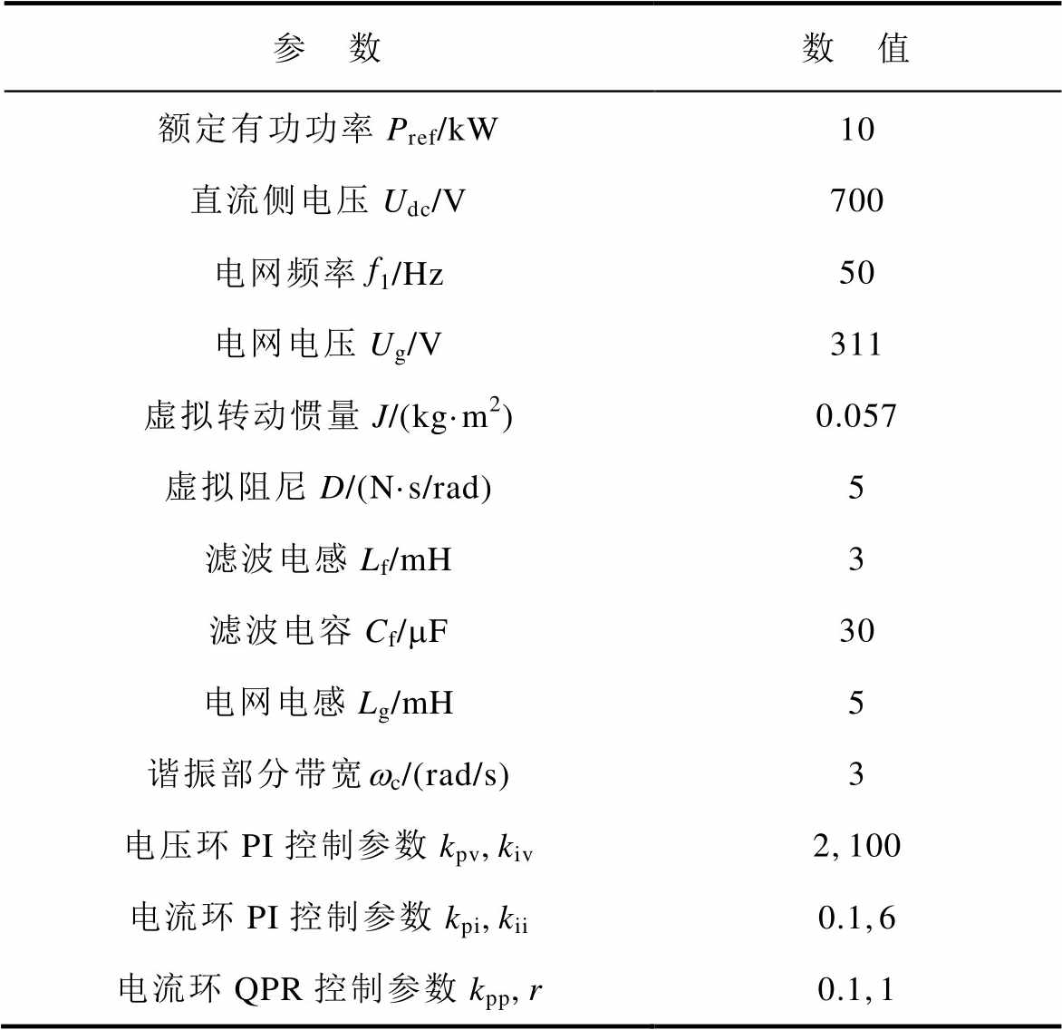 参 数数 值 额定有功功率Pref/kW10 直流侧电压Udc/V700 电网频率f1/Hz50 电网电压Ug/V311 虚拟转动惯量J/(kg·m2)0.057 虚拟阻尼D/(N·s/rad)5 滤波电感Lf/mH3 滤波电容Cf/mF30 电网电感Lg/mH5 谐振部分带宽wc/(rad/s)3 电压环PI控制参数kpv,kiv2,100 电流环PI控制参数kpi,kii0.1,6 电流环QPR控制参数kpp,r0.1,1