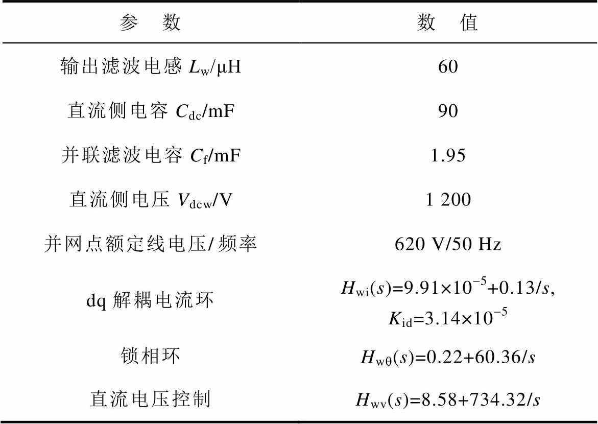 参 数数 值 输出滤波电感Lw/μH60 直流侧电容Cdc/mF90 并联滤波电容Cf/mF1.95 直流侧电压Vdcw/V1 200 并网点额定线电压/频率620 V/50 Hz dq解耦电流环Hwi(s)=9.91×10-5+0.13/s,Kid=3.14×10-5 锁相环Hwq(s)=0.22+60.36/s 直流电压控制Hwv(s)=8.58+734.32/s