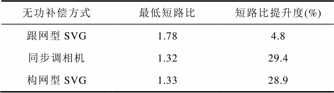 无功补偿方式最低短路比短路比提升度(%) 跟网型SVG1.784.8 同步调相机1.3229.4 构网型SVG1.3328.9