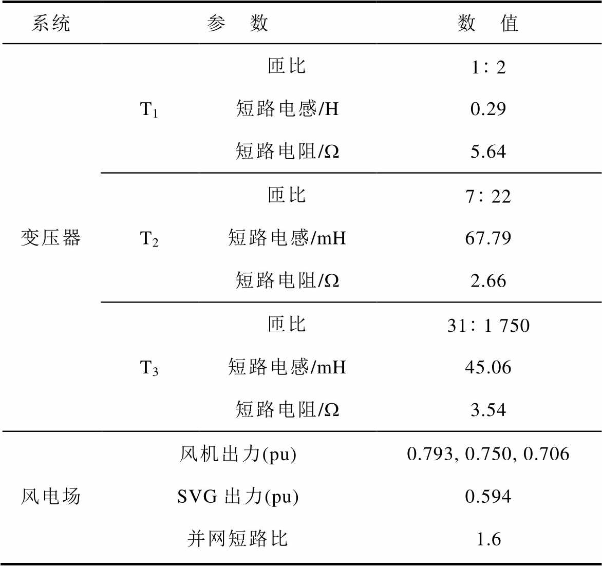 系统参 数数 值 变压器T1匝比12 短路电感/H0.29 短路电阻/W5.64 T2匝比722 短路电感/mH67.79 短路电阻/W2.66 T3匝比311 750 短路电感/mH45.06 短路电阻/W3.54 风电场风机出力(pu)0.793, 0.750, 0.706 SVG出力(pu)0.594 并网短路比1.6