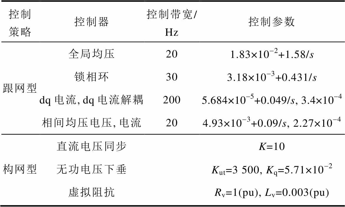 控制策略控制器控制带宽/Hz控制参数 跟网型全局均压201.83×10-2+1.58/s 锁相环303.18×10-3+0.431/s dq电流,dq电流解耦2005.684×10-5+0.049/s, 3.4×10-4 相间均压电压,电流204.93×10-3+0.09/s, 2.27×10-4 构网型直流电压同步K=10 无功电压下垂Kut=3 500, Kq=5.71×10-2 虚拟阻抗Rv=1(pu), Lv=0.003(pu)
