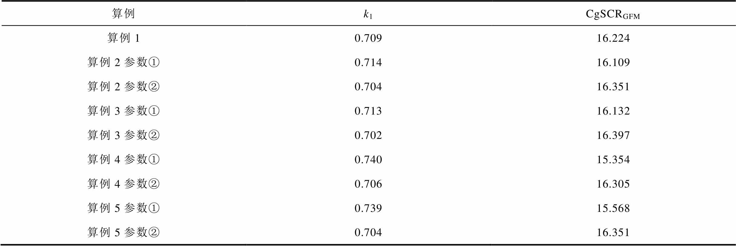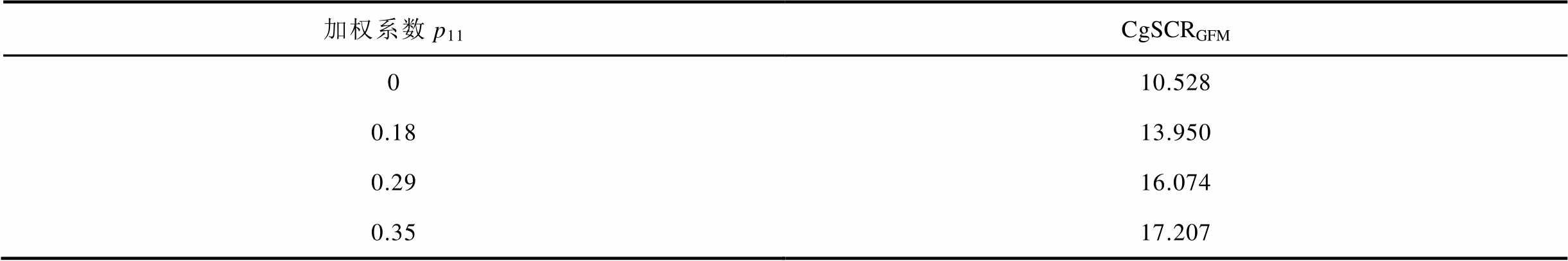 设备1不同加权系数下系统的CgSCRGFM见附表7。由附表7可知,构网型设备1的加权系数越大,特征子系统对应的CgSCRGFM越大,说明随着构网型设备1的加权系数增大,设备1对系统稳定性的改善程度增加,系统稳定性逐渐得到改善。此外,也可以理解为随着加权系数增加,设备1与其余设备的交互作用程度增大,对稳定性的影响程度随之增加。