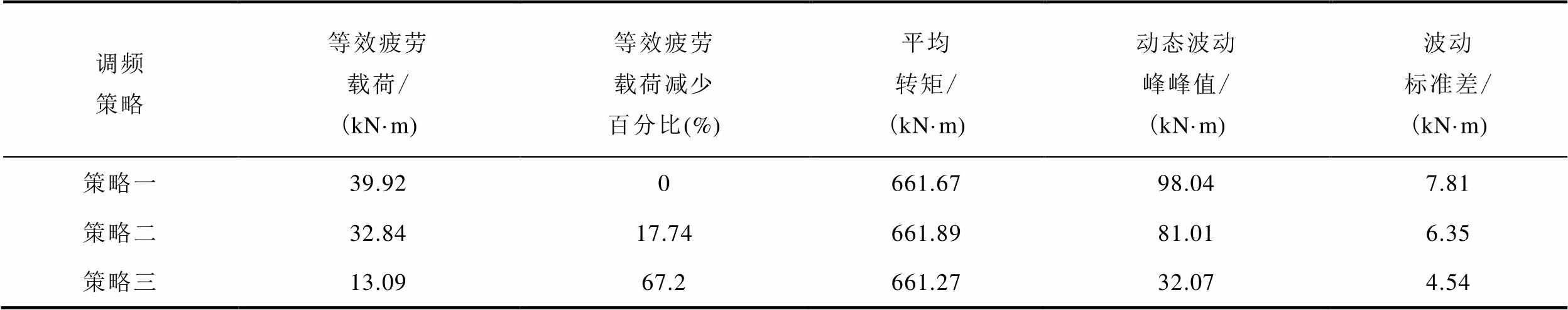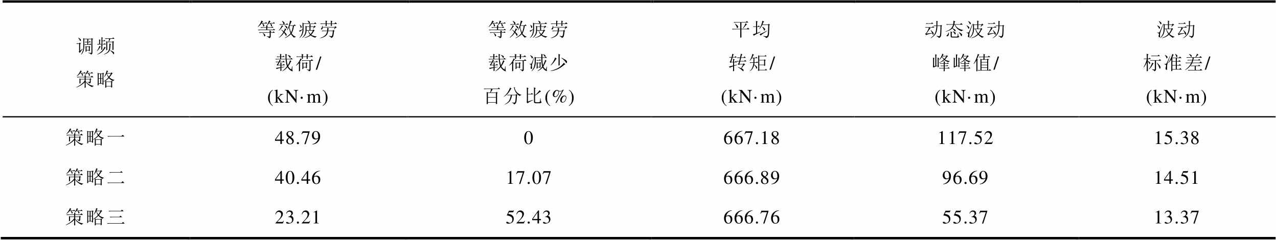 调频策略等效疲劳载荷/(kN·m)等效疲劳载荷减少百分比(%)平均转矩/(kN·m)动态波动峰峰值/(kN·m)波动标准差/(kN·m) 策略一48.790667.18117.5215.38 策略二40.4617.07666.8996.6914.51 策略三23.2152.43666.7655.3713.37