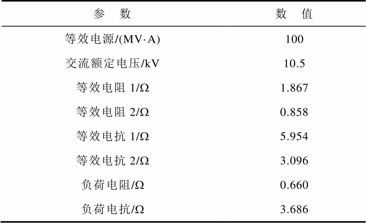 参 数数 值 等效电源/(MV·A)100 交流额定电压/kV10.5 等效电阻1/W1.867 等效电阻2/W0.858 等效电抗1/W5.954 等效电抗2/W3.096 负荷电阻/W0.660 负荷电抗/W3.686