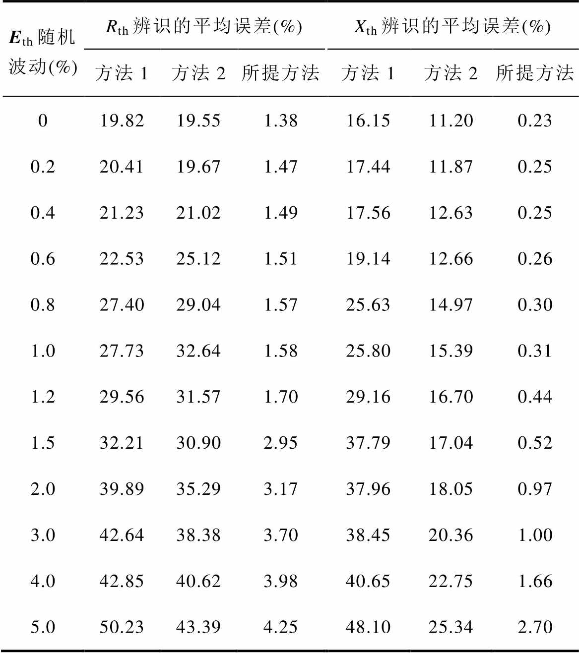 波动场景设置负荷阻抗以±5%的幅度进行随机波动保持不变,而系统侧等效电动势波动分别以±0.2%、±0.4%、±0.6%等随机波动进行变化。将本文所提方法与传统方法1(基于最小二乘的阻抗辨识法[10])和方法2(基于协方差的阻抗辨识法[16])进行对比分析。