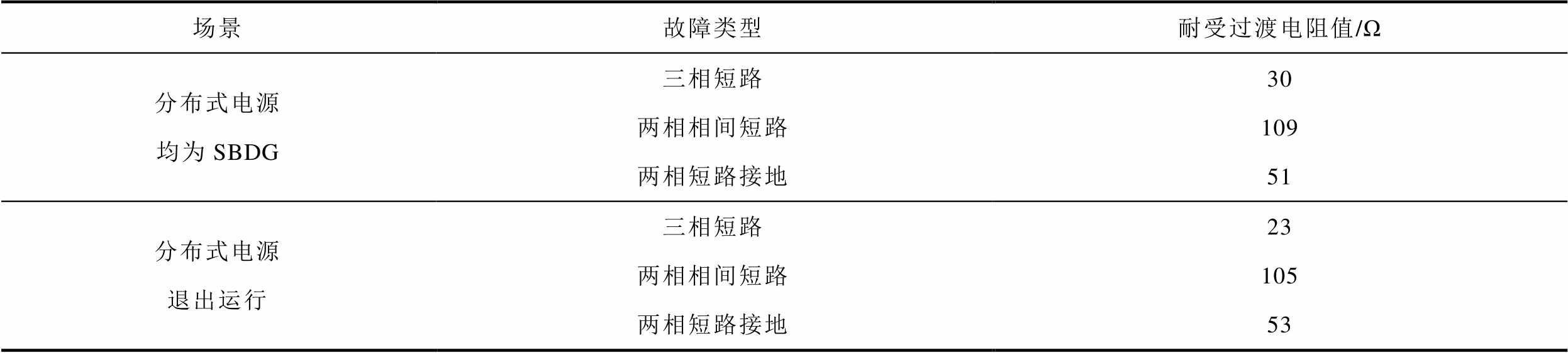 场景故障类型耐受过渡电阻值/Ω 分布式电源均为SBDG三相短路30 两相相间短路109 两相短路接地51 分布式电源退出运行三相短路23 两相相间短路105 两相短路接地53