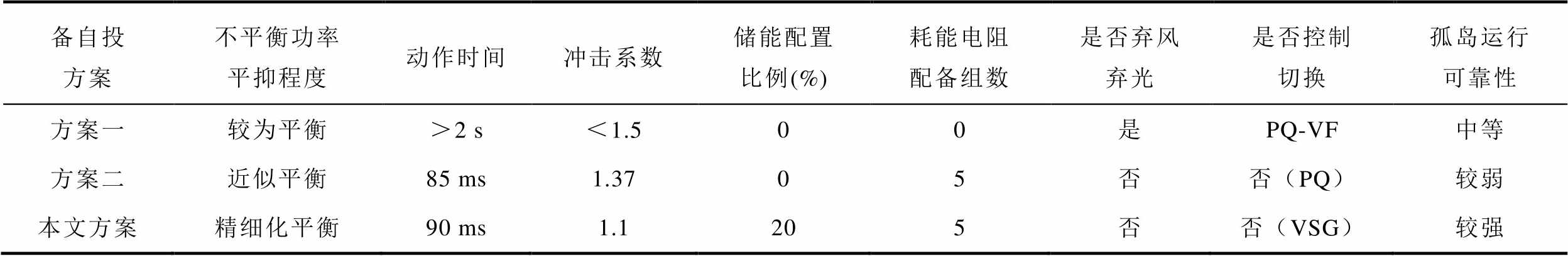 为进一步说明所提方案的优越性,以仿真场景1为例,将现有不解列光伏前提下的备自投方案与本文方案进行对比分析,结果见表3。其中,方案一与方案二分别通过调整光伏出力[10]和投入缓冲电阻/切除负荷[14]的方式补偿不平衡功率,从而实现备自投的动作。