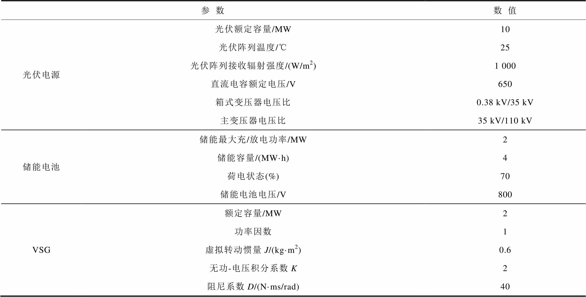 参数数值 光伏电源光伏额定容量/MW10 光伏阵列温度/℃光伏阵列接收辐射强度/(W/m2)直流电容额定电压/V箱式变压器电压比主变压器电压比251 0006500.38 kV/35 kV35 kV/110 kV 储能电池储能最大充/放电功率/MW储能容量/(MW·h)荷电状态(%)储能电池电压/V2470800 VSG额定容量/MW功率因数虚拟转动惯量J/(kg·m2)无功-电压积分系数K阻尼系数D/(N·ms/rad)210.6240