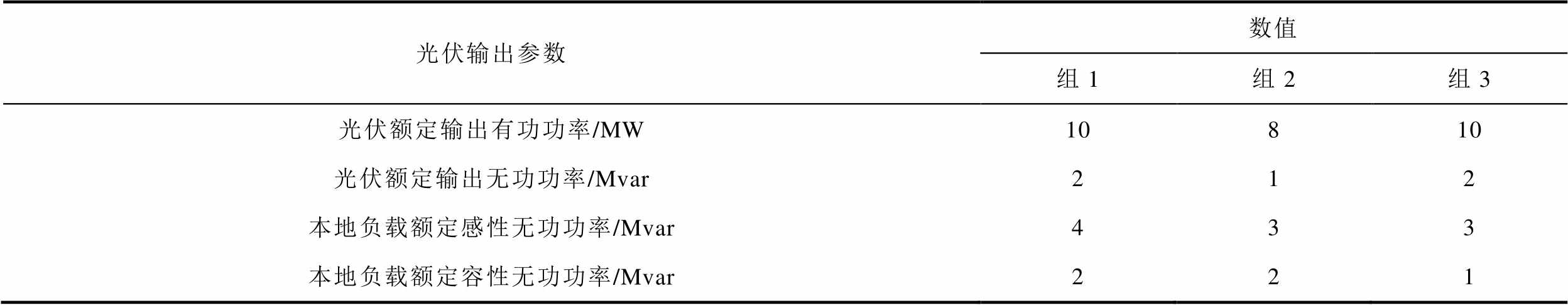 光伏输出参数数值 组1组2组3 光伏额定输出有功功率/MW10810 光伏额定输出无功功率/Mvar本地负载额定感性无功功率/Mvar本地负载额定容性无功功率/Mvar242132231