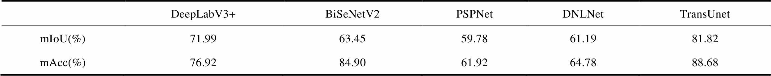 DeepLabV3+BiSeNetV2PSPNetDNLNetTransUnet mIoU(%)71.9963.4559.7861.1981.82 mAcc(%)76.9284.9061.9264.7888.68