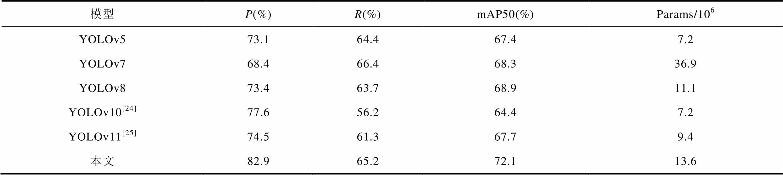 模型P(%)R(%)mAP50(%)Params/106 YOLOv573.164.467.47.2 YOLOv768.466.468.336.9 YOLOv873.463.768.911.1 YOLOv10[24]77.656.264.47.2 YOLOv11[25]74.561.367.79.4 本文82.965.272.113.6