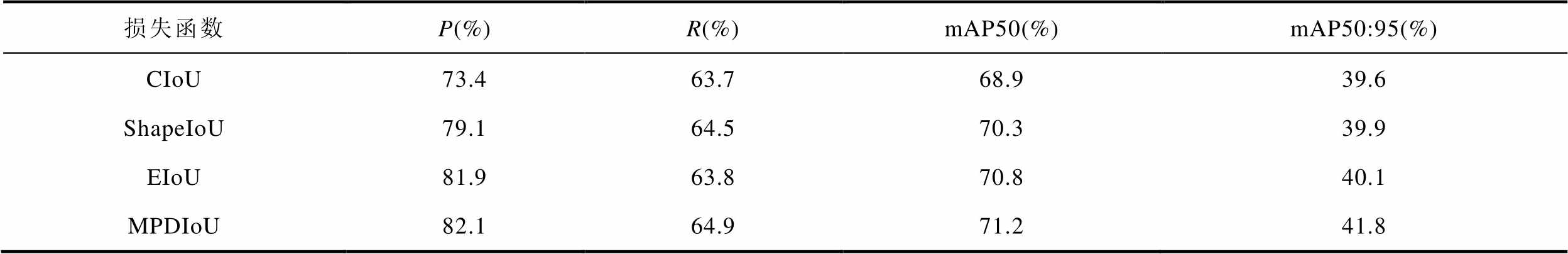 损失函数P(%)R(%)mAP50(%)mAP50:95(%) CIoU73.463.768.939.6 ShapeIoU79.164.570.339.9 EIoU81.963.870.840.1 MPDIoU82.164.971.241.8
