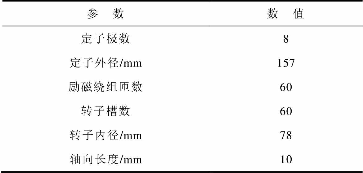 参 数数 值 定子极数8 定子外径/mm157 励磁绕组匝数60 转子槽数60 转子内径/mm78 轴向长度/mm10