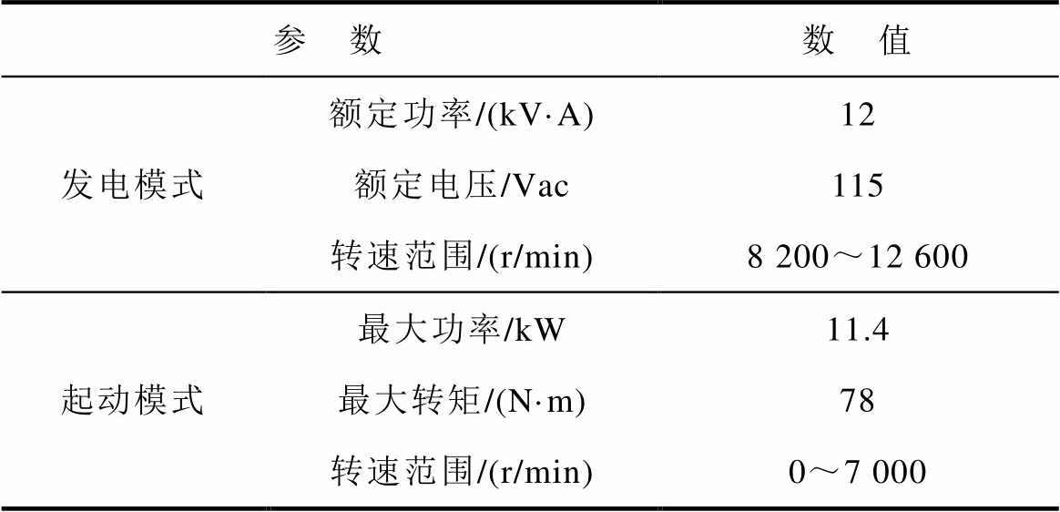 参 数数 值 发电模式额定功率/(kV·A)12 额定电压/Vac115 转速范围/(r/min)8 200~12 600 起动模式最大功率/kW11.4 最大转矩/(N·m)78 转速范围/(r/min)0~7 000