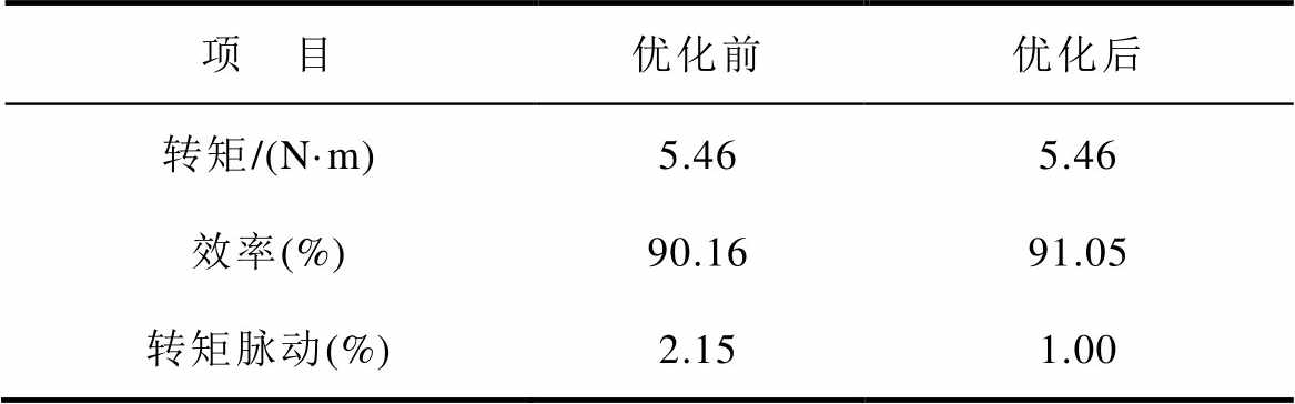 项 目优化前优化后 转矩/(N·m)5.465.46 效率(%)90.1691.05 转矩脉动(%)2.151.00