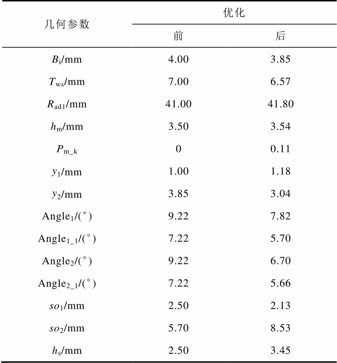 几何参数优化 前后 Bi/mm4.003.85 Tws/mm7.006.57 Rad1/mm41.0041.80 hm/mm3.503.54 Pm_k00.11 y1/mm1.001.18 y2/mm3.853.04 Angle1/(°)9.227.82 Angle1_1/(°)7.225.70 Angle2/(°)9.226.70 Angle2_1/(°)7.225.66 so1/mm2.502.13 so2/mm5.708.53 hs/mm2.503.45
