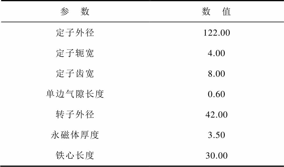 参 数数 值 定子外径122.00 定子轭宽4.00 定子齿宽8.00 单边气隙长度0.60 转子外径42.00 永磁体厚度3.50 铁心长度30.00