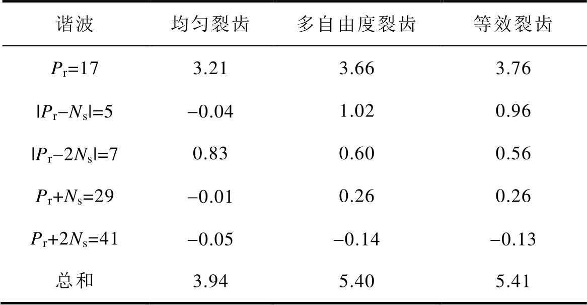分离计算了各阶次谐波转矩贡献见表5。可以看出,均匀裂齿的谐波转矩总和为3.94 N·m,多自由度裂齿谐波转矩总和为5.40 N·m,等效裂齿的谐波转矩总和为5.41 N·m,与有限元直接计算结果的吻合度达到了99%以上,这表明谐波转矩分离计算是正确的。此外,均匀裂齿的正向工作谐波仅有7、17次,而多自由度裂齿与等效裂齿的工作谐波有5、7、17、29次。因此,PMVM具有更高的转矩密度,分析结果也符合第1节的推论。