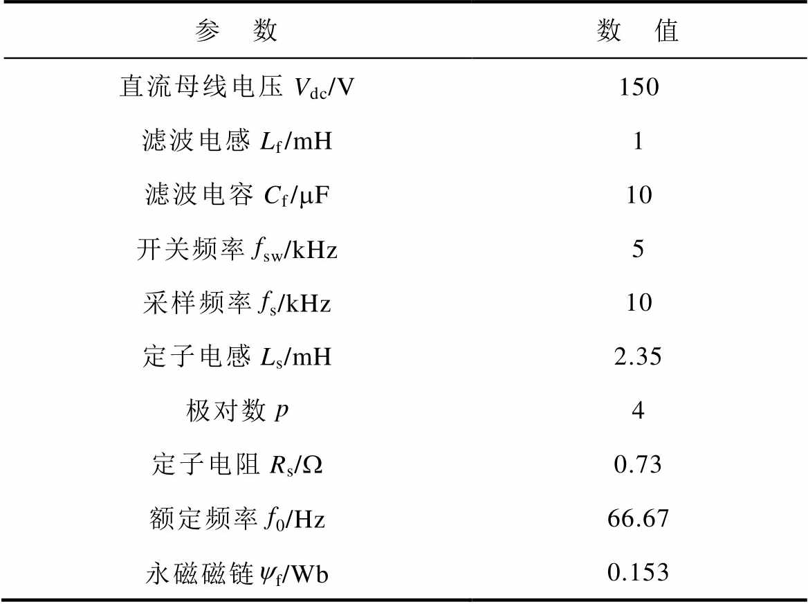 参 数数 值 直流母线电压Vdc/V150 滤波电感Lf/mH1 滤波电容Cf/mF10 开关频率fsw/kHz5 采样频率fs/kHz10 定子电感Ls/mH2.35 极对数p4 定子电阻Rs/W0.73 额定频率f0/Hz66.67 永磁磁链yf/Wb0.153
