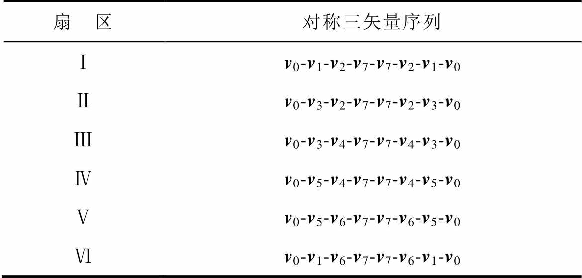 扇 区对称三矢量序列 Ⅰv0-v1-v2-v7-v7-v2-v1-v0 Ⅱv0-v3-v2-v7-v7-v2-v3-v0 Ⅲv0-v3-v4-v7-v7-v4-v3-v0 Ⅳv0-v5-v4-v7-v7-v4-v5-v0 Ⅴv0-v5-v6-v7-v7-v6-v5-v0 Ⅵv0-v1-v6-v7-v7-v6-v1-v0