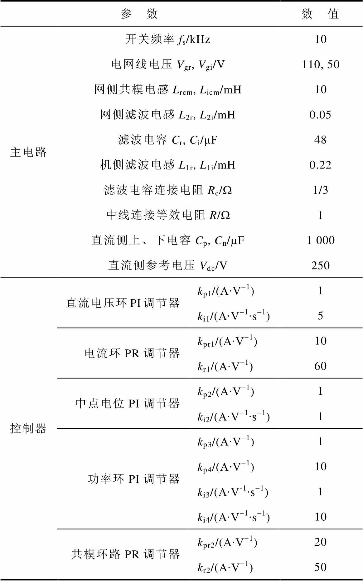 参 数数 值 主电路开关频率fs/kHz10 电网线电压Vgr, Vgi/V110, 50 网侧共模电感Lrcm, Licm/mH10 网侧滤波电感L2r, L2i/mH0.05 滤波电容Cr, Ci/μF48 机侧滤波电感L1r, L1i/mH0.22 滤波电容连接电阻Rc/W1/3 中线连接等效电阻R/W1 直流侧上、下电容Cp, Cn/mF1 000 直流侧参考电压Vdc/V250 控制器直流电压环PI调节器kp1/(A∙V-1)1 ki1/(A∙V-1∙s-1)5 电流环PR调节器kpr1/(A∙V-1)10 kr1/(A∙V-1)60 中点电位PI调节器kp2/(A∙V-1)1 ki2/(A∙V-1∙s-1)1 功率环PI调节器kp3/(A∙V-1)1 kp4/(A∙V-1)10 ki3/(A∙V-1∙s-1)1 ki4/(A∙V-1∙s-1)10 共模环路PR调节器kpr2/(A∙V-1)20 kr2/(A∙V-1)50