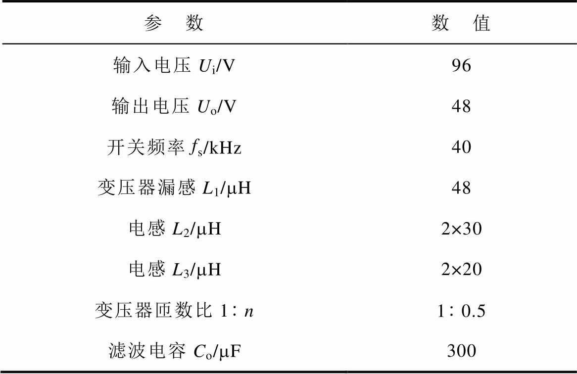 参 数数 值 输入电压Ui/V96 输出电压Uo/V48 开关频率fs/kHz40 变压器漏感L1/mH48 电感L2/mH2×30 电感L3/mH2×20 变压器匝数比1n10.5 滤波电容Co/mF300