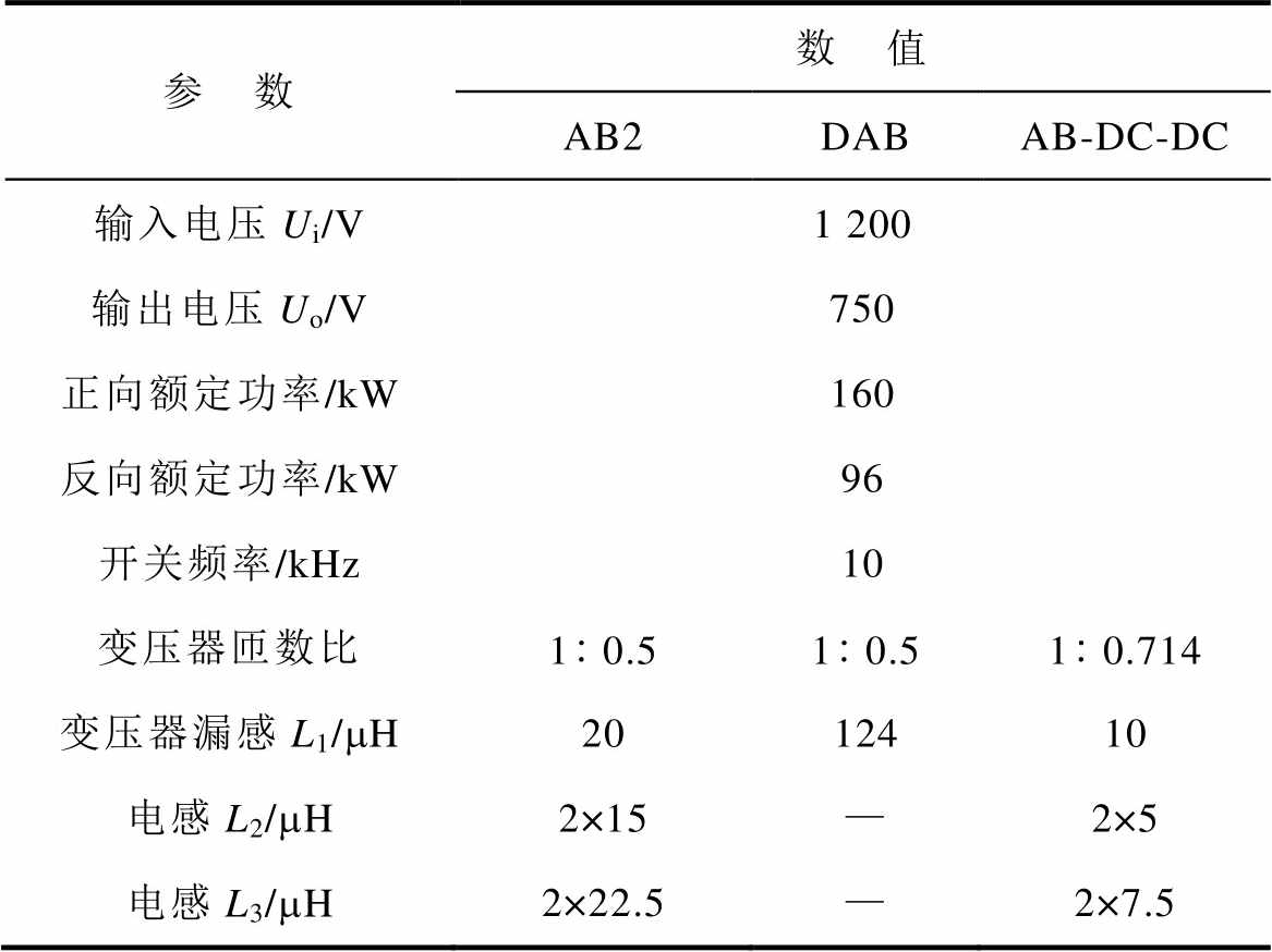 2)与AB-DC-DC相比,AB2具有抑制环流功率的能力,间接利于提升整机容量。通过针对具体算例的概念性设计与仿真对比可验证AB2相较于DAB,AB-DC-DC在成本、电流应力、损耗和可靠性方面的优势。