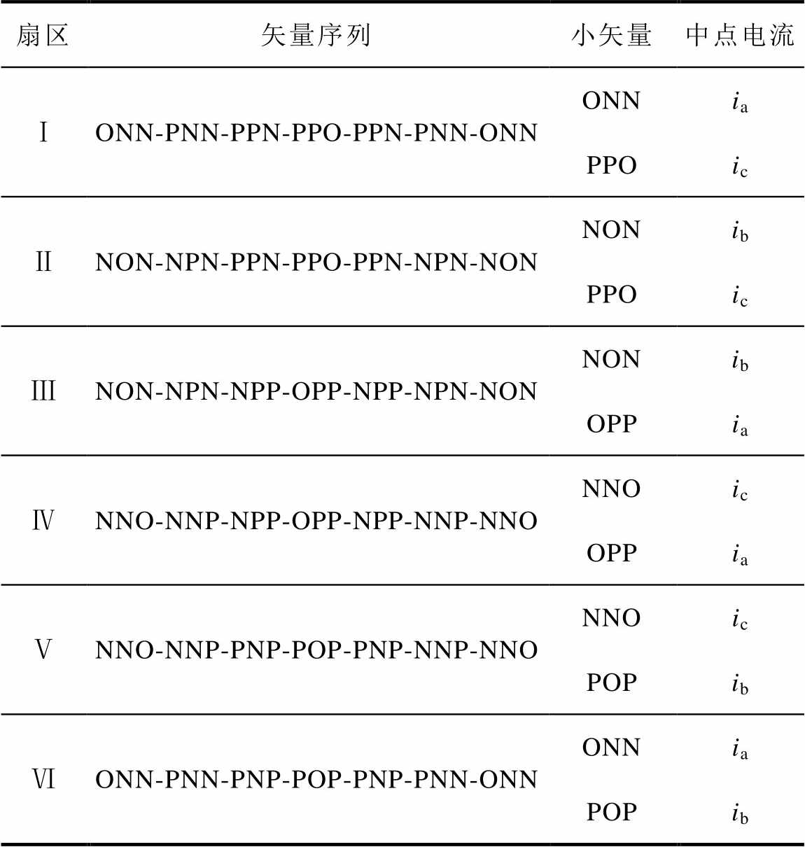扇区矢量序列小矢量中点电流 ⅠONN-PNN-PPN-PPO-PPN-PNN-ONNONNia PPOic ⅡNON-NPN-PPN-PPO-PPN-NPN-NONNONib PPOic ⅢNON-NPN-NPP-OPP-NPP-NPN-NONNONib OPPia ⅣNNO-NNP-NPP-OPP-NPP-NNP-NNONNOic OPPia ⅤNNO-NNP-PNP-POP-PNP-NNP-NNONNOic POPib ⅥONN-PNN-PNP-POP-PNP-PNN-ONNONNia POPib