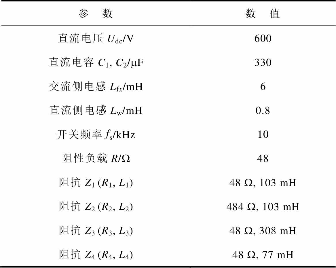 参 数数 值 直流电压Udc/V600 直流电容C1, C2/mF330 交流侧电感Lfx/mH6 直流侧电感Lw/mH0.8 开关频率fs/kHz10 阻性负载R/W48 阻抗Z1 (R1, L1)48 W, 103 mH 阻抗Z2 (R2, L2)484 W, 103 mH 阻抗Z3 (R3, L3)48 W, 308 mH 阻抗Z4 (R4, L4)48 W, 77 mH