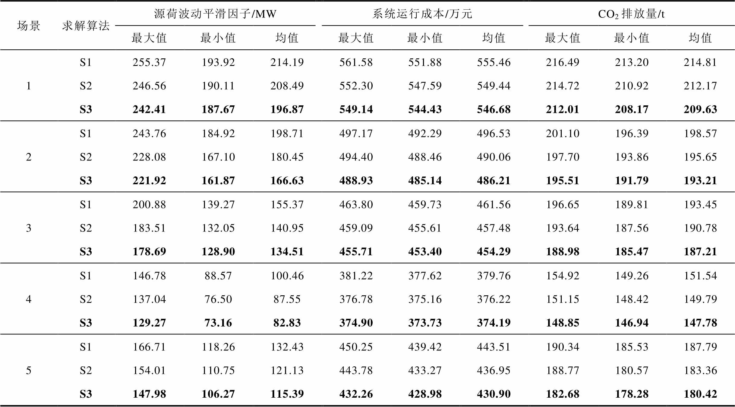 由表4可知,S3求解得到的目标函数最大值、最小值、均值均优于S1和S2,在场景2和场景5中,S3的均值甚至比S1和S2的最小值更低。具体表现为:在场景2中,与S1相比,S3的源荷波动平滑因子、系统运行成本和CO2排放量最优值分别降低12.46%、1.45%和2.34%;与S2相比,S3的目标函数最优值分别降低3.13%、0.68%、1.07%。在场景5中,S3与S1和S2相比,源荷波动平滑因子最优值分别降低10.14%和4.05%;系统运行成本最优值分别降低2.38%和0.99%;CO2排放量最优值分别降低3.91%和1.27%。此外,S3求得的目标函数最优值与均值之间的偏差比S1和S2更小,表明S3的收敛性能更佳。