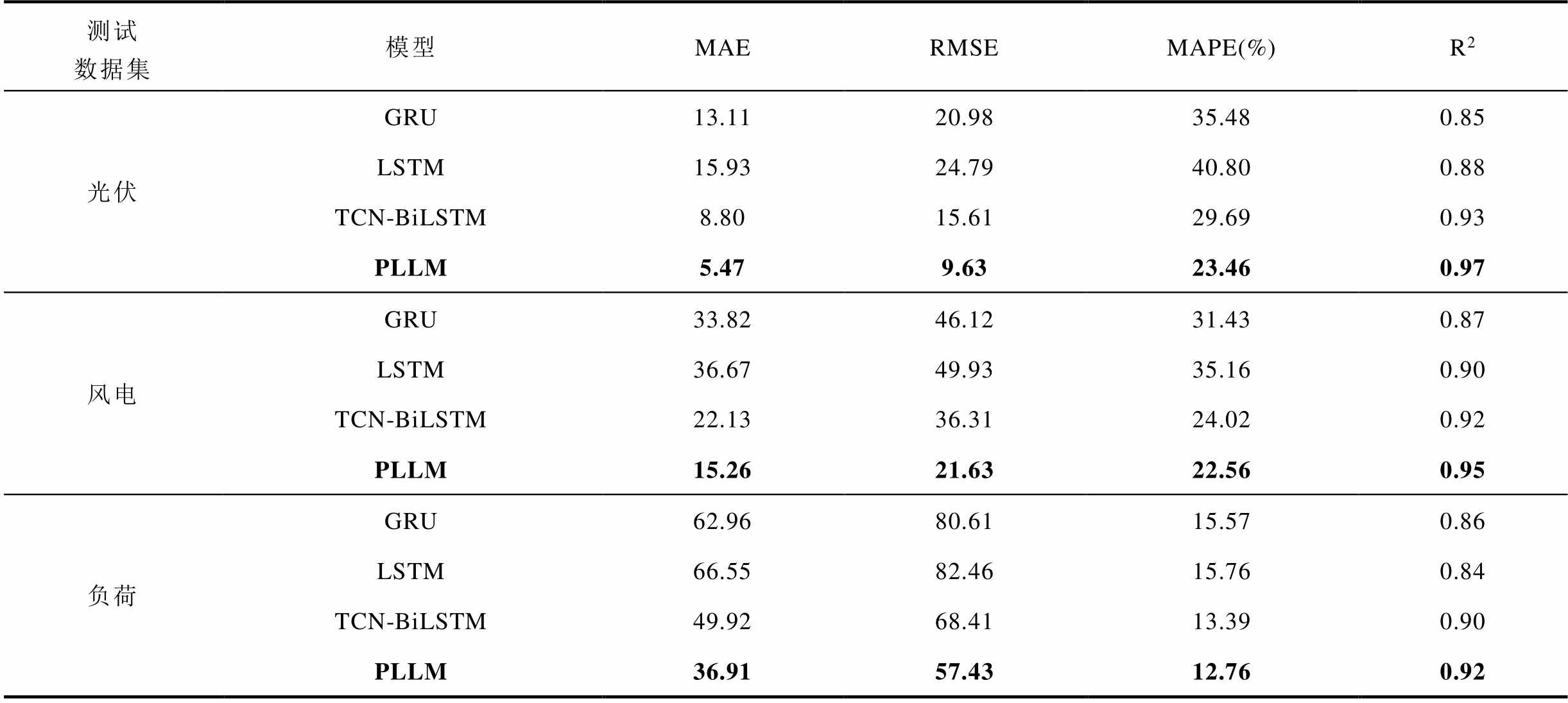 测试数据集模型MAERMSEMAPE(%)R2 光伏GRU13.1120.9835.480.85 LSTM15.9324.7940.800.88 TCN-BiLSTM8.8015.6129.690.93 PLLM5.479.6323.460.97 风电GRU33.8246.1231.430.87 LSTM36.6749.9335.160.90 TCN-BiLSTM22.1336.3124.020.92 PLLM15.2621.6322.560.95 负荷GRU62.9680.6115.570.86 LSTM66.5582.4615.760.84 TCN-BiLSTM49.9268.4113.390.90 PLLM36.9157.4312.760.92