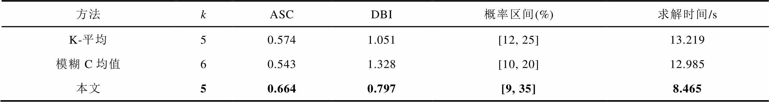 方法kASCDBI概率区间(%)求解时间/s K-平均50.5741.051[12, 25]13.219 模糊C均值60.5431.328[10, 20]12.985 本文50.6640.797[9, 35]8.465