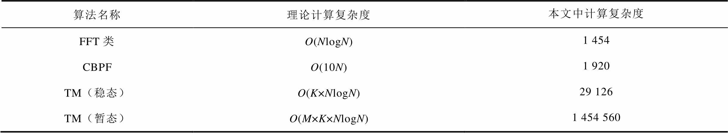 算法名称理论计算复杂度本文中计算复杂度 FFT类O(NlogN)1 454 CBPFO(10N)1 920 TM(稳态)O(K×NlogN)29 126 TM(暂态)O(M×K×NlogN)1 454 560