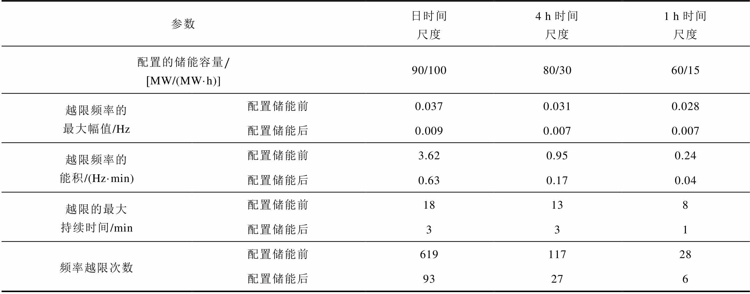 分别在不同时间尺度下,按照本文评估的调频能力需求在算例系统中配置相应容量的储能,并计算配置储能后的越限频率的最大幅值、越限频率的最大持续时间、越限频率的能积以及频率越限次数,其与配置储能前的比较见表5。可以发现,按照本文评估结果配置储能,能够有效地减小不同时间尺度下越限频率的最大幅值、能积、最大持续时间,并且将频率越限次数均减少了75%以上。