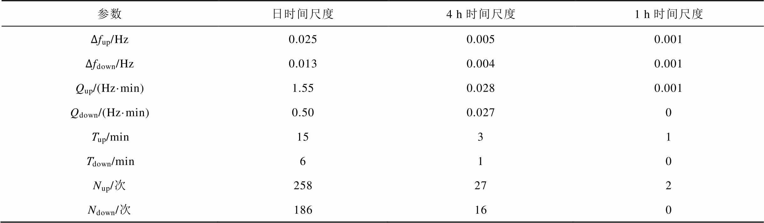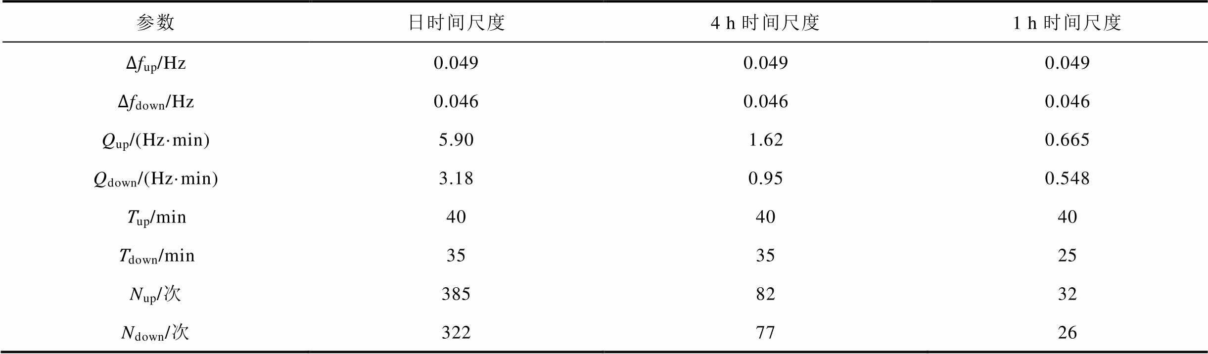 参数日时间尺度4 h时间尺度1 h时间尺度 Δfup/Hz0.0250.0050.001 Δfdown/Hz0.0130.0040.001 Qup/(Hz·min)1.550.0280.001 Qdown/(Hz·min)0.500.0270 Tup/min1531 Tdown/min610 Nup/次258272 Ndown/次186160
